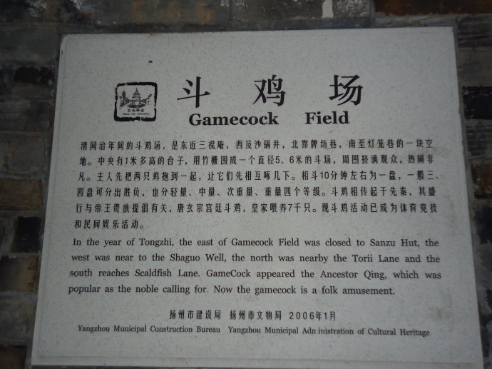 在揚州東關街長樂客棧南邊、在壺園的北面,找到了“斗雞場”,巷子不長,還拐了個90度的彎,不留心就會找不到。